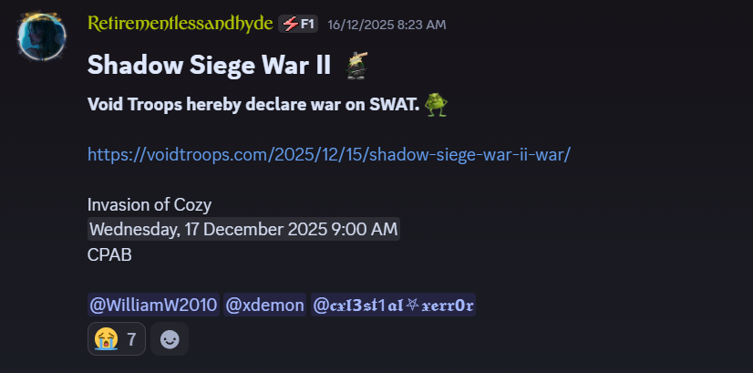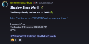 On December 15, the Void Troops declared war on SWAT, naming it the Shadow Siege War II. They were able to emerge victorious after being able to annex their single server, Cozy, where SWAT was unable to attend.