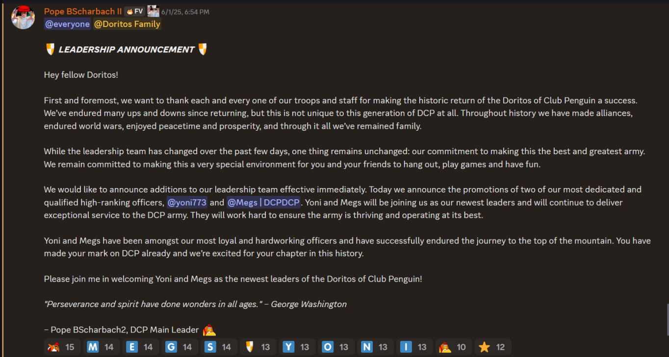 On June 1, the Doritos of Club Penguin faced new additions in their leadership. This happened a few days after the former leader, Kira, announced her retirement and moved to the Void Troops, with Bscharbach2 taking her place in the leadership. Bschar announced that alongside him, there would be two people joining him in the leadership. Those were Megha and Yoni773, with Yoni stepping down hours after his induction.