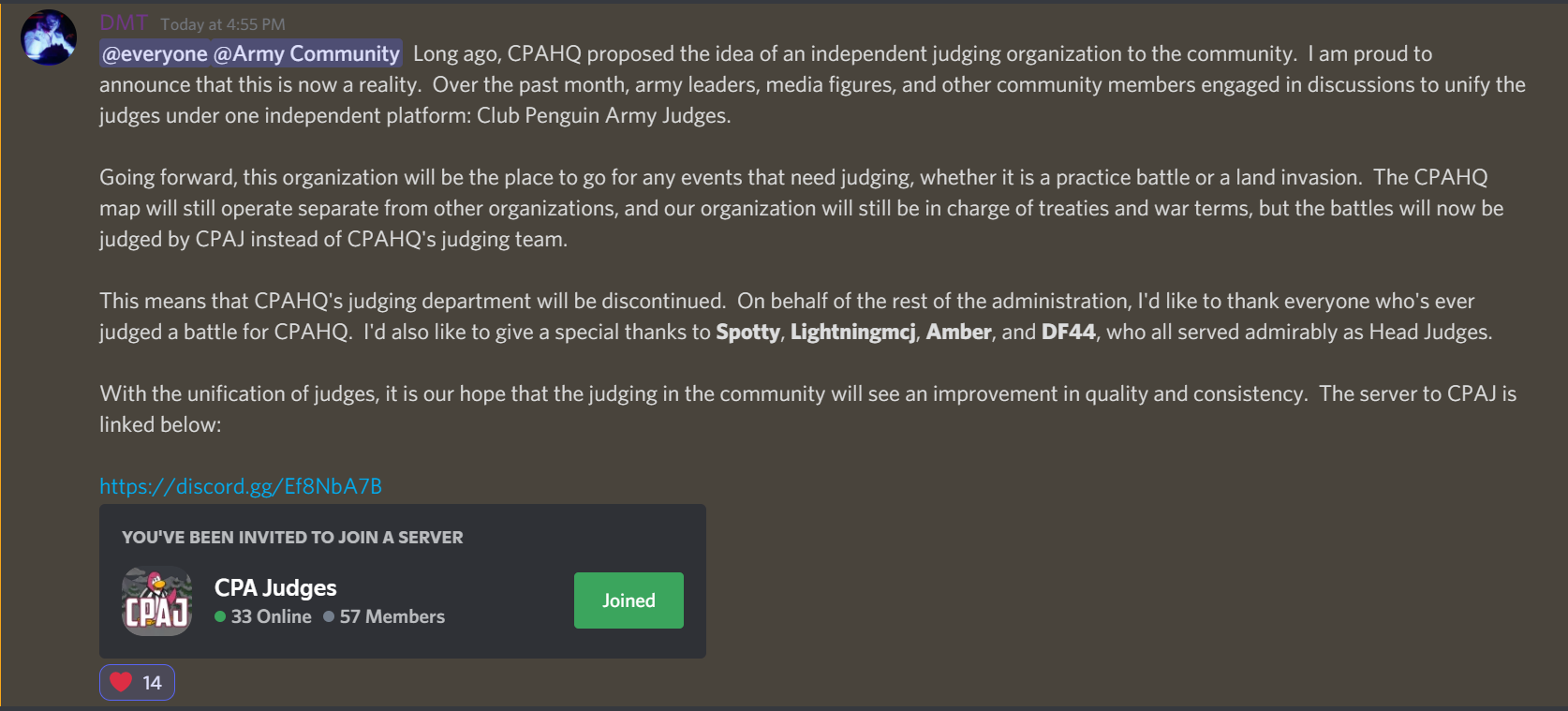 These efforts ultimately resulted in the creation of the Club Penguin Army Judges in February 2022, establishing the first unified, independent judging body in the community to ensure consistency, neutrality, and long-term stability.