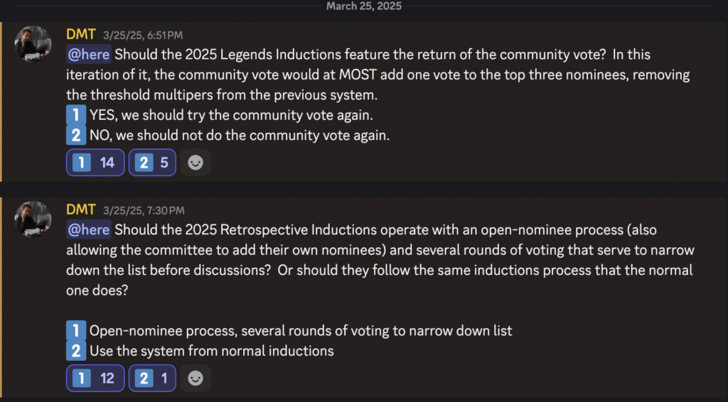 As shown above, those present voted largely in favor of the return of the old community vote. For those unfamiliar, prior to 2023, Legends Inductions held a community vote on a list of nominees decided upon by the committee. The look of this varied throughout the years, with the most recent iteration of it being a set threshold that garnered nominees an extra yes vote if they hit it (typically 50% of votes) and an additional vote for the nominees that were in the top three of voting. This was changed for several reasons that are a bit too lengthy to discuss in an already drawn-out foreword. However, the community engagement on the Community Nominee system introduced in 2023 [and modified in 2024] was not as high as the committee desired. Thus, the decision was made to revert to a community vote, which frequently saw higher voter turnout.