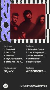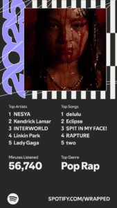 Welcome to Judy‘s 2025 Spotify Wrapped. Where do I even begin? As we can see from her top artist, Judy tried very hard this year to be different by searching for the most underground artists she could find and playing them on loop. Unfortunately for her, her true colours showed throughout the rest of her list. Linkin Park and Kendrick Lamar on the same page says a lot to me; Judy is attempting to hate to her fullest potential while being stuck in her emo phase from 2007. Her top songs show me that she is constantly switching between rage and peace faster than you can say ‘mood swings’.