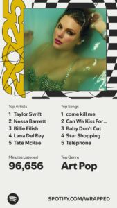 To start this off, 96,656 minutes of listening is exactly 67 days (pun intended), and shows that I have no life whatsoever and practically live in my headphones. It also says that I am a very indecisive person who can not decide between being happy and being sad. As we can see, I can switch from Lady Gaga to Billie Eilish in the blink of an eye and clearly need to make up my mind. Finally, Taylor Swift as my top artist? So basic and unoriginal, I need to touch grass.