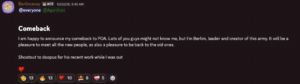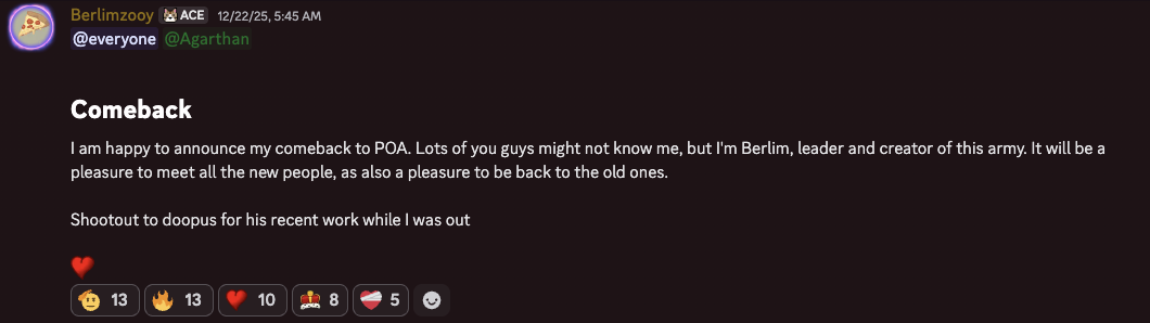On December 22, Berlim officially announced his return to POA after three months of inactivity, aiming for a new start for the army. With his return, the army seems to be kickstarting a new era under his leadership once more.