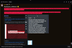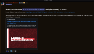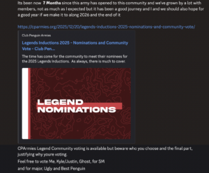In the Elite Guardians Discord server, potential voters were asked to vote for Ghostt. This was also advised against in the original post, as seen above. It must be noted that, due to the original message being in Portuguese, it is possible that the translation provided was not exact and could misconstrue what was being said in the message. Nevertheless, armies should not bring up individuals in their announcements, unless it is simply to state that they were nominated or to congratulate them on said nomination. Fortunately, no votes were found to be influenced by this message.