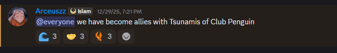 Denizmyn is the sole leader of the Tsunamis, who has driven the alliance with Phoenix leader Arceuszz. According to the Phoenix leader, their friendship was a key factor in this alliance. However, not many details about this alliance have been disclosed publicly. Moreover, Denizmyn has been in the Void Troops and the Rebel Penguin Federation before as a troop, while Arceuszz has been in the Tsunamis before. Lately, it has also been noticed that the two have been very helpful in each other’s events, showing that the army has established a strong connection.