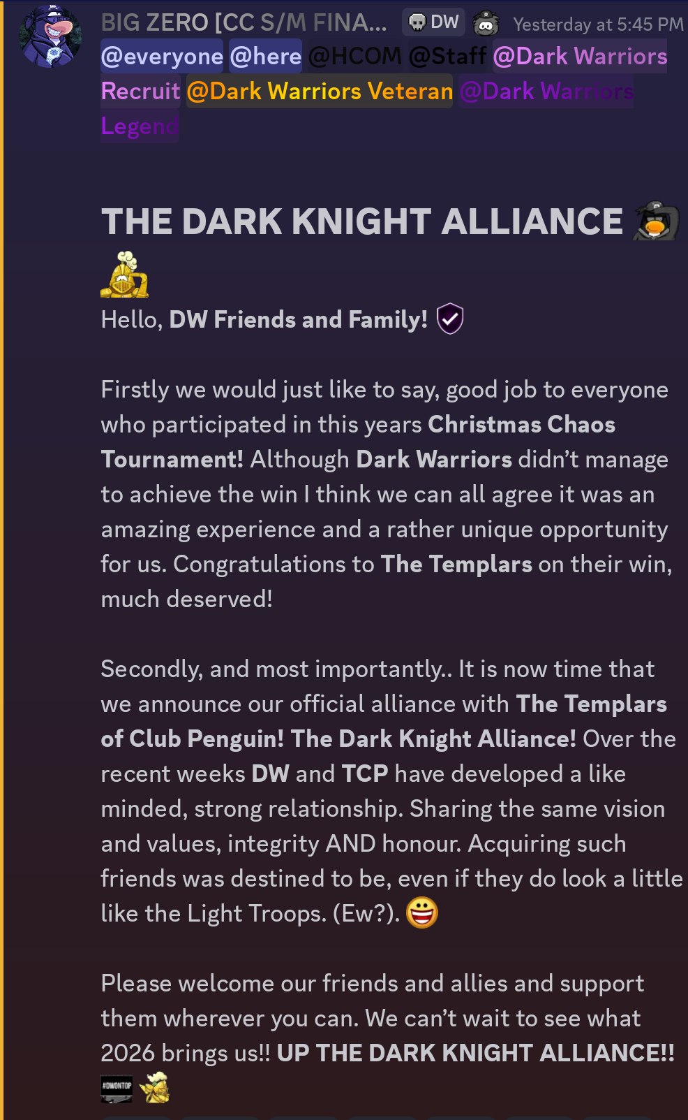 On January 3rd, 2025, the Templars of Club Penguin and Dark Warriors formed a new ‘Dark Knight’ Alliance. Let us walk through a brief history of the two armies and why they decided to ally!