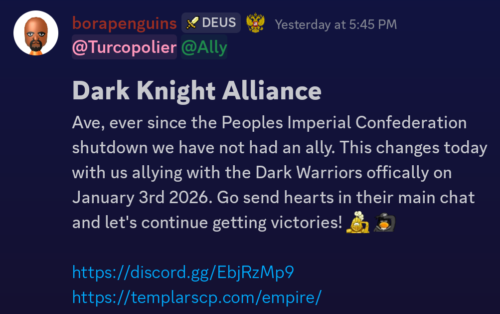 On January 3, 2025, both armies announced the new alliance in their respective Discord servers, with this being their first new alliance in quite some time.
