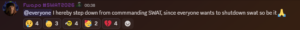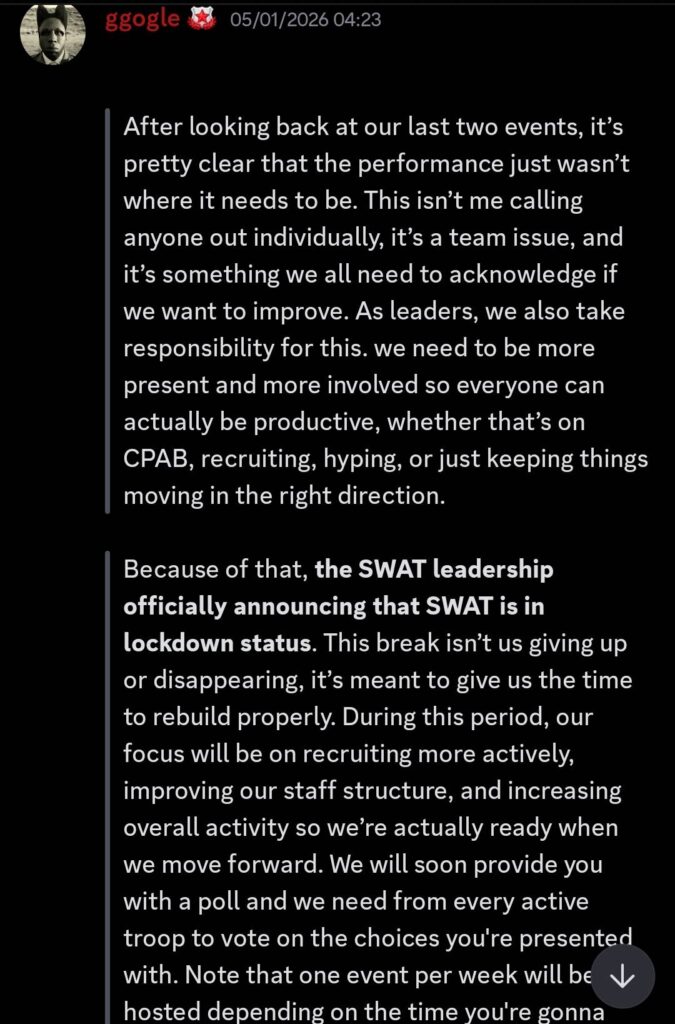 However, this did not last long. Leaders attributed this decline to a noticeable lack of staff participation, weak recruiting efforts, and an overall drop in internal activity and morale. As a result, events became inconsistent, leadership and engagement among members faded, making it difficult for the army to function. Leaders initially allied to strengthen both sides, but it instead created confusion about the command structure and overall goals. Without a clear plan or active leadership to stabilise the situation, SWAT struggled to maintain its identity and momentum within the community.