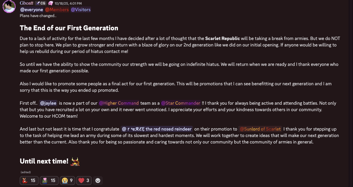 The Scarlet Republic reformed, shortly after the hiatus began, on December 11, 2025. Since then, they rebuilt their alliance through the new year. However, suddenly on January 5th, they decided to end both alliances. From their announcement on Discord, they stressed that they do not have issues with either army. Instead, they felt that in their first generation, having fewer alliances was beneficial, especially with newer S/M armies. They are in the process of finding new alliances to replace the two they dropped.