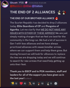 Riri: With EGCP going on hiatus, we thought it’d be best if we dropped the alliance for the time being as we would like to focus on growing our second generation right now. we also didn’t really feel that our armies’ levels of engagement and support were fully aligned anymore. overall, we just figured we work a lot better with fewer alliances and are very grateful to the two of them for all they’ve done for us in the past 💕