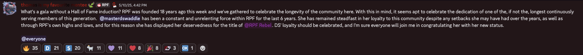 MasterDS began her journey in 2019, when she joined the Rebel Penguin Federation through Club Penguin Rewritten. She joined the army as a recruit, though, being new to Discord, she did participate in a few events. She returned to the army on August 4, 2020, and has since remained loyal to the army. Eventually, she reached the position of High Command in 2024 and has aided the army in nearly every tournament, such as Legends Cup, October Horrors, and Christmas Chaos. Undoubtedly, this showed her unmatched dedication and perseverance as a member of RPF. In 2025, the army recognised her efforts, awarding her the title of RPF Rebel.