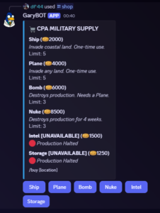 - Fog of War: Each team will have a dedicated channel to buy their items in the server shop and for discussion. All transactions will be confidential. When a team army gets bombed/nuked, they will be notified about it.