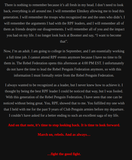 2017 marked the end of the community as many knew it following the shutdown of the original Club Penguin. Twitchy was certain that Elmikey’s confidence in him to guide that generation would live on in his memory forever. He would recall both the soldiers who backed him and those who did not. Despite his disagreements with the RPF leadership, he still regarded them as friends. Above all, he would recall each person and their influence on his life. He no longer looked at historical figures and wanted to emulate them. He grown into his own place and had even earned a place on the RPF Hall of Fame, being regarded as a legend.