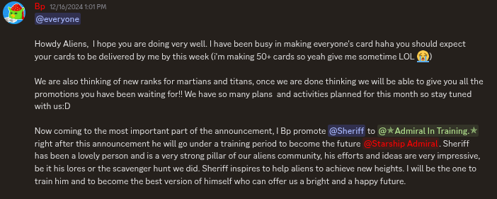 On April 7, the co-founder and leader of the Aliens, Bestpenguin, formally appointed him as the 11th Starship Commander after his promotion to Admiral-In-Training, recognizing his pledged loyalty, commitment, and enduring dedication to the army and community. The elevation was well deserved and an esteemed honor, as it was evident that the Aliens had identified a promising leader to guide them forward for major tournaments.