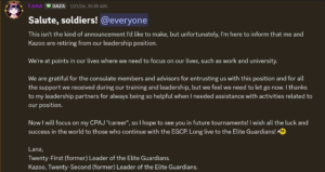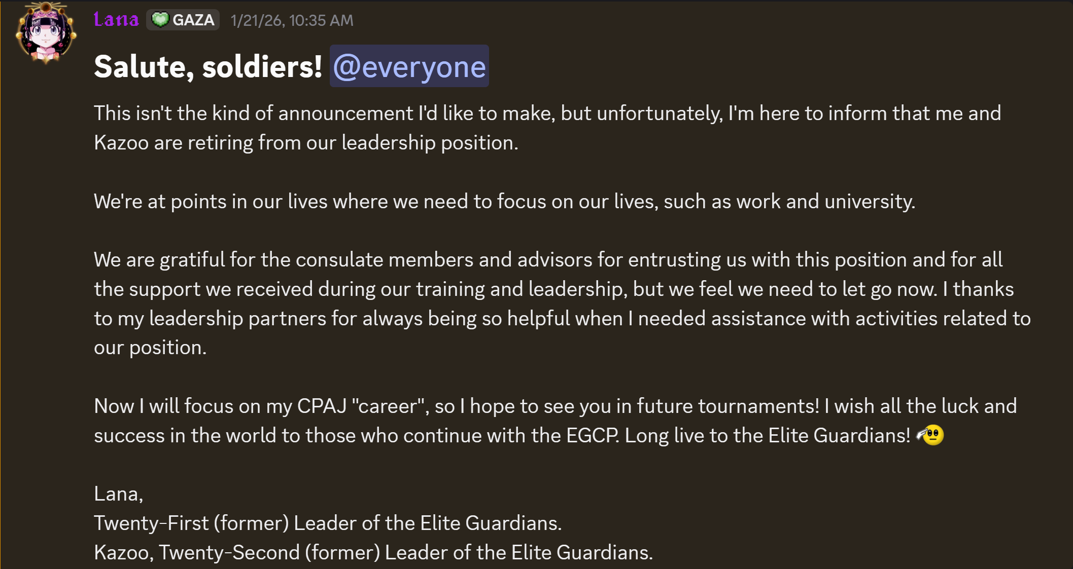 This was followed by multiple Top Ten placements under tenth place in August. They attempted to help the army in September with the return of Lass, an influential former leader of EGCP. Their leadership continued with mediocre performance around this time, despite the army’s best efforts to grow quickly. The army’s performance took a slight hit again with the breakup of the EGCP and Shadow Legionnaires alliance over controversy. This led to another former leader, Iosephus, returning to leadership to help the team out after the rebellion of some staff during the controversy. Unfortunately, this didn’t lead to much of an improvement, with yet another hiatus announced on January 9, 2026. In her interview, Lana attributed this hiatus to all leaders attending college and having jobs, which made running the army difficult. This finally culminated in the retirements of both Lana and Kazoo on January 21, 2026, for unspecified reasons.