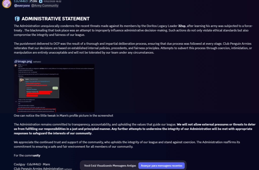 On February 17, DCP had suffered a major force treaty created by the Army of Club Penguin, with whom they had been engaged in war. This war ended with one of the DCP troops having spread an ACP troop’s face without their consent. This violated a war term and CPA’s rules on doxxing, resulting in severe punishment. Furthermore, this would only be the beginning of DCP’s issues, as they continued to make questionable decisions that would not fare well for them.