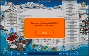 Operation: Winter Storm is a tournament hosted by Club Penguin Armies to beta test its new map. Players are divided into four teams, set by their army if affiliated and chosen if not, namely Red, Blue, Green, and Black, all fighting for land, aiming to have the most by Sunday. Since the last time we checked in on this tournament, almost all free land had been taken, and intense battles had taken place, with over 40 penguins online in some. Some rivalries have formed, with Red fighting Black and Green fighting Blue. Some teams have done better than others, but no team has been eliminated yet.