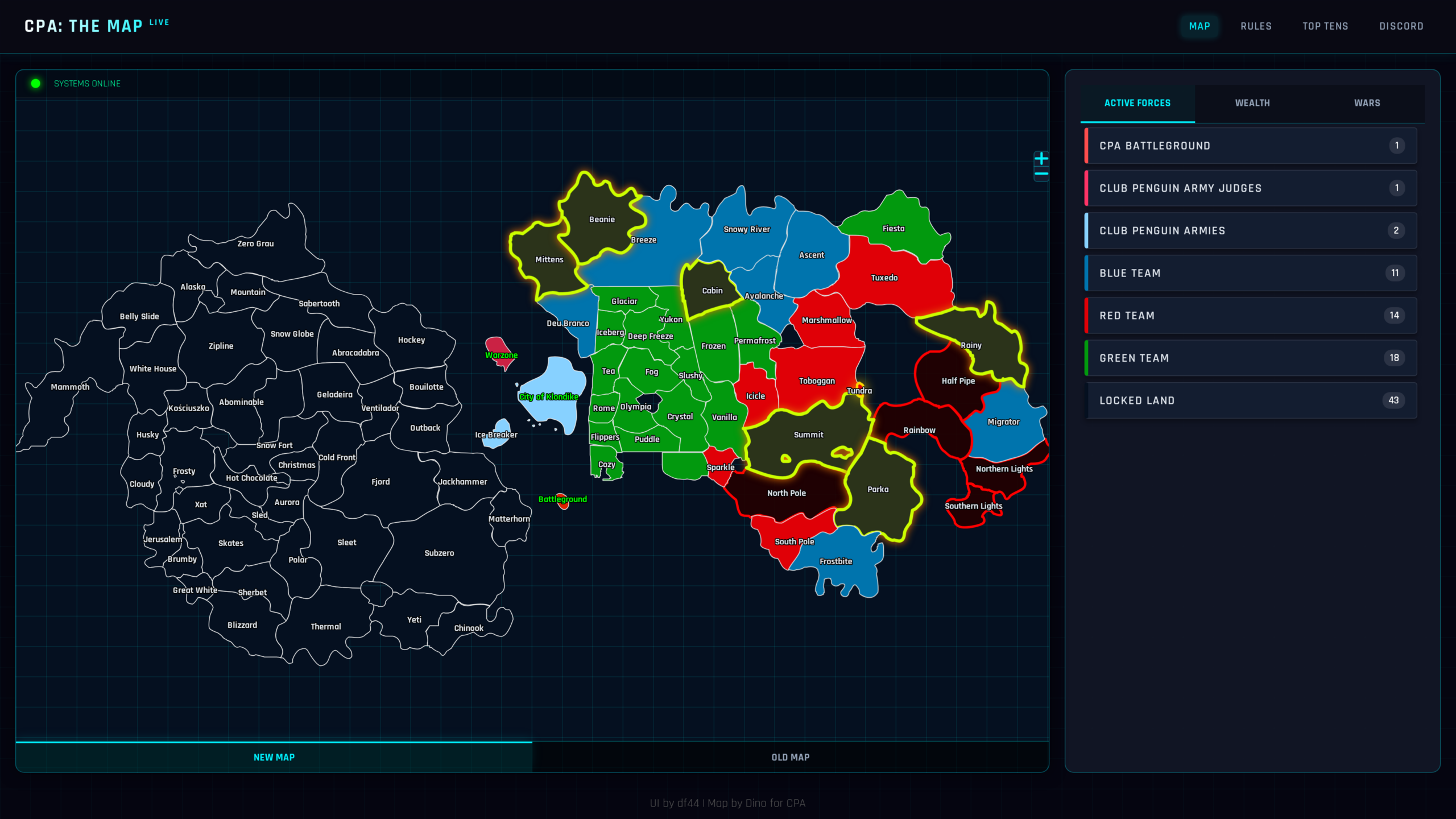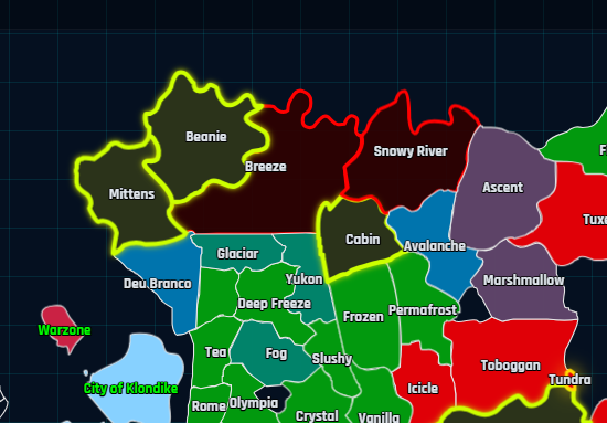 Club Penguin Armies introduced a new tourney, Operation: Winter Storm, to beta test its new map. Players are divided into four teams, Red, Blue, Green, and Black, all fighting for land, aiming to have the most by Sunday. Since the last time we checked in on this tournament, all free land has been taken, and intense battles had taken place as of day 7. Some rivalries have formed, as well as some alliances.