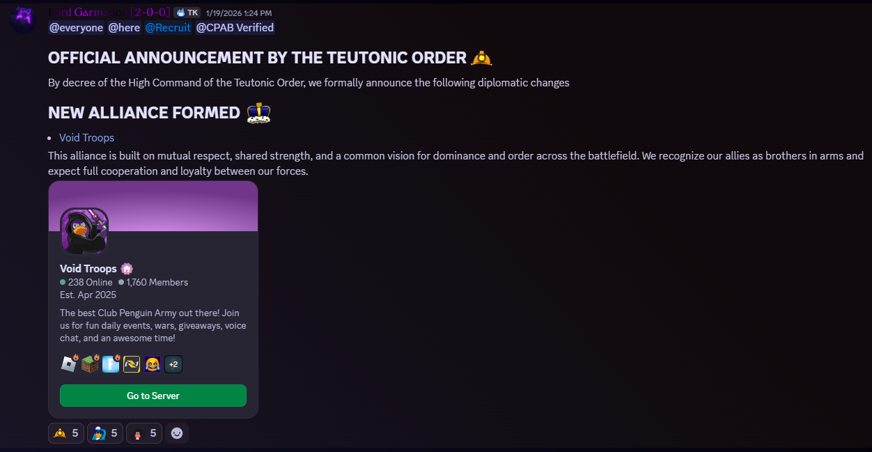 This past week, an alliance between the Teutons and the Void Troops was publicly announced to their respective armies. They named the alliance the “Knights of the Void Alliance”. With the Teutons being led by Void Troops founder Justin, this alliance was more than expected to occur.