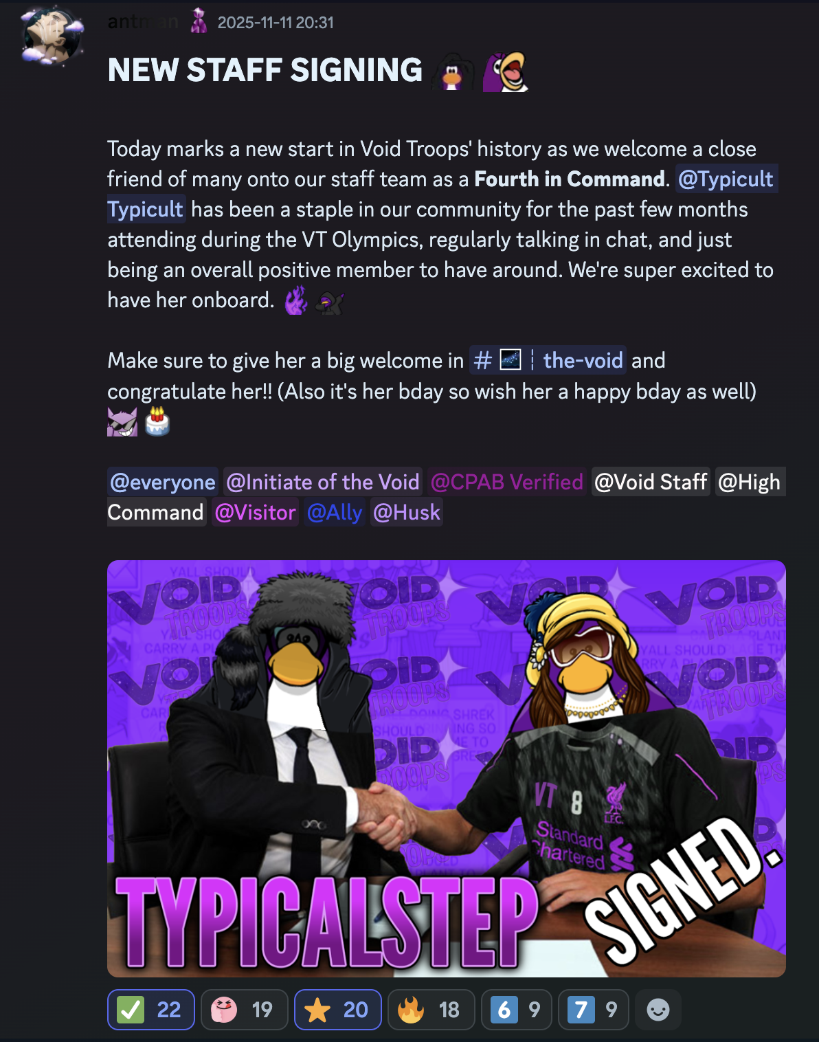 After retiring from Aliens at the beginning of November 2025, Typical started her new chapter. On November 11, 2025, Void Troops announced the enlistment of Typical as a Fourth-in-Command.