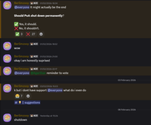On January 2nd, Berlim hosted a poll in the army, asking members whether PoA should shut down permanently, and most members declined. After that, he said he didn’t have support and asked members for suggestions.