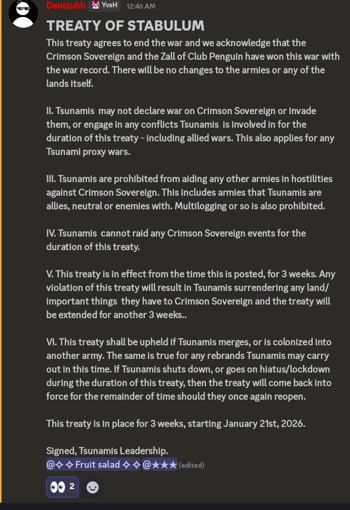 The Crimson Sovereign entered the community under the leadership of Fruit Salad and was active in the Small/Medium community from April to May 2025 before going on hiatus. The army’s founder then hosted a spontaneous New Year’s event, leading to the revival of the army on January 6, 2026. The new generation has been full of wars, starting with a war against the Penguins of Agartha, and now a war against the Tsunamis.