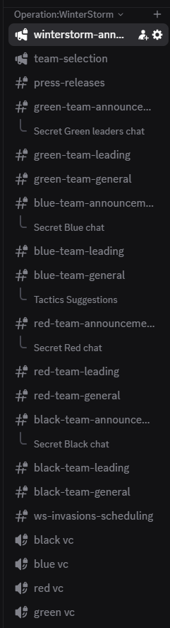 Since the entire thing was based around CPA, as it was CPA’s community participating, the channels had to be made in the CPA server. Thus, many tournament channels popped up, with people getting access to them depending on their roles. WinterStorm announcements, where various organisation announcements regarding the entire tournament and its settings took place, and team selection channels were public for all army community members, regardless of their participation.