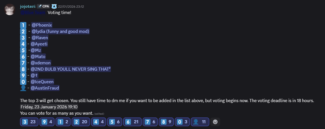 Upon joining a team, people could submit their name to become candidates in the internal team elections. One day before the tournament began, the elections took place based on who was interested. People in each team followed different ways to get more popularity and attempt to get elected. Some teams also had more candidate choices than others. For example, both the Green team and the Red had 4, Black had 6, but faced huge issues with its leadership, and Blue had 11. You can see who became a leader in which team in the Meet the Leaders post. Ironically, two of the three Red leaders were theoretically “on leave” during the tournament.