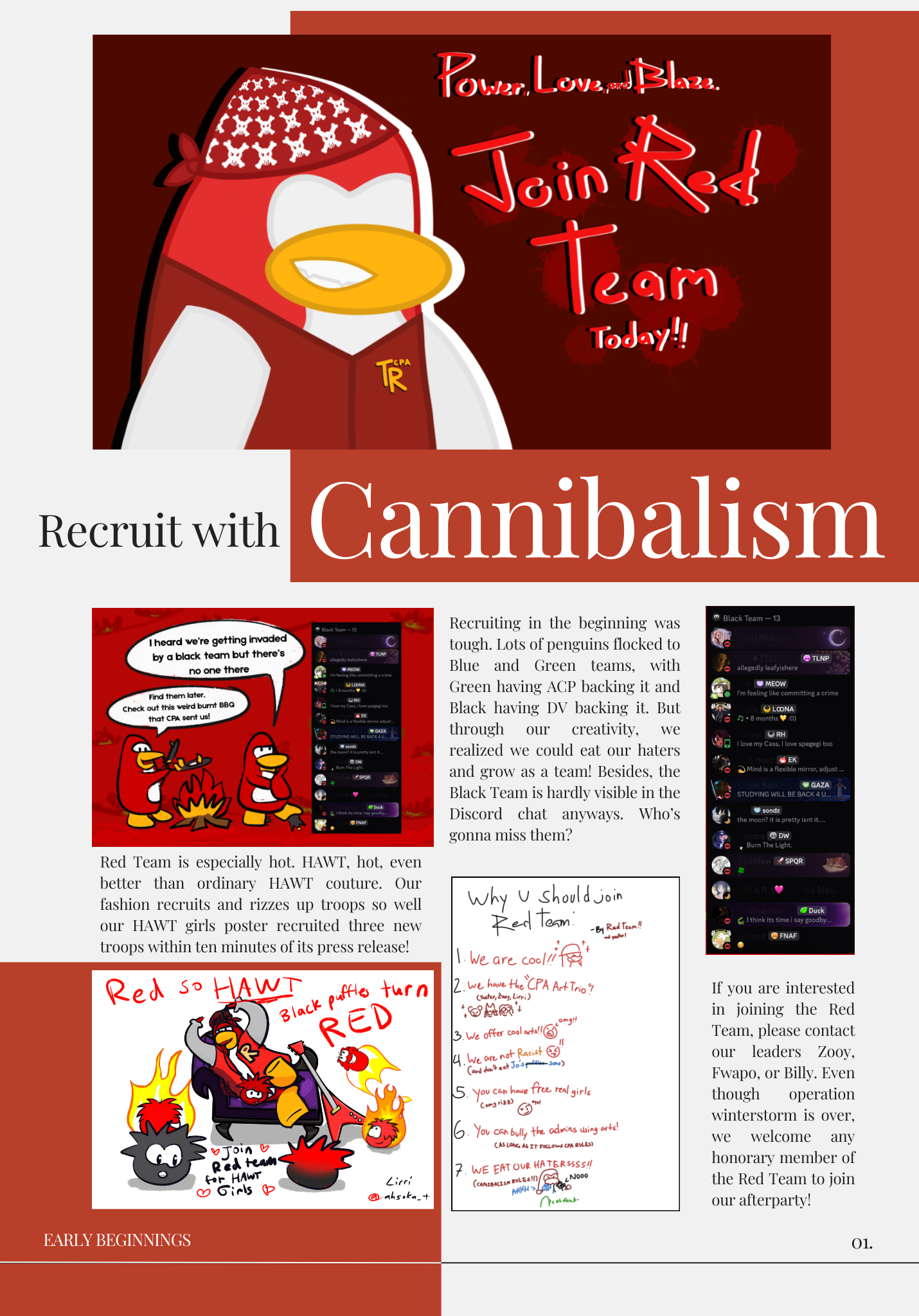 This team probably produced the most propaganda, also having the CPA Artist trio in it. In the recap posts, the propaganda included mainly consists of Red propaganda. It was the team that recruited many people into CPA. Even people who had not been in the community before, which gave them an edge, compared to other teams. They even recruited through the mainchat and tried to troopsteal whenever it was possible. They were initially targeted by Black, but managed to generate much hype and fully destroy them.