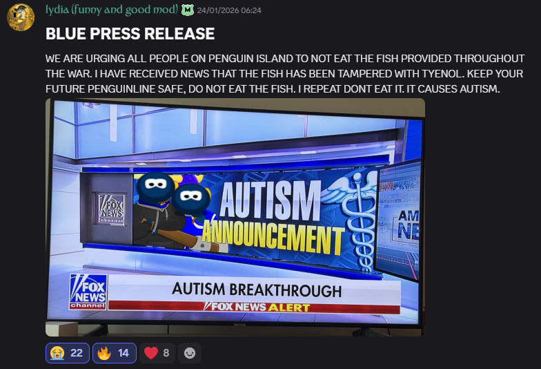 The team barely used the leading chat, leading and hyping events in the general chat instead. They were probably the most chaotic team. Initially targeted by both Red and Blue, with their conflict with Red becoming more intense each day. Shoutout to their propaganda attempts in the press release channel and Clade‘s drawings.