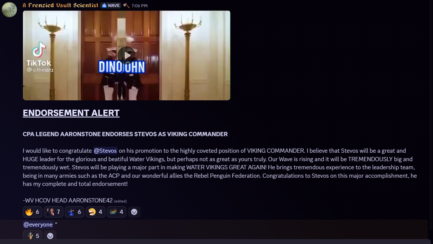 In 2024, he transitioned to the Rebel Penguin Federation, where he made a lasting impact over the nearly year-long tenure, achieving the rank of Fourth in Command. This further solidified his reputation within the community. In August 2025, Stevos joined the Water Vikings. Just a few days later, he attained the esteemed position of staff in training and joined the Viking Academy program, marking a new chapter in his remarkable journey.