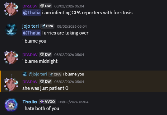 The potential cure that was suggested did not work, and Pranav himself ended up being infected. This was followed by several other active people in the Dark Warriors being infected as well, in a domino effect. Due to both Pranav and Thalia being very active in several servers, including the CPA one as well, the virus has spread beyond their army. It has been noted that more and more people from the army community are turning into furries every day that passes. Many members of the Media department, where Pranav is the most active, have been observed having a meow cough. These include Mary, Phoenix, Samio, and Lucifer.