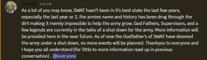 On February 23, Special Weapons and Tactics was deemed shut down following a brief announcement by Domsamillion. This much-expected development comes after many months of frequent war and consistent leadership changes. Moreover, this conclusion arrived after a month of internal discussion and debate on various matters within the army, including a potential reduction of Legoman’s privileges, which later lost favor. Among the people in discussion were prominent SWAT figures, including Godfathers TacoDaily, Zuke, Legoman, and IsaacDaVinci, with Ganger90 showing slight external involvement in the discussion. At the moment, SWAT is claiming to prepare a more detailed website post describing the situation.