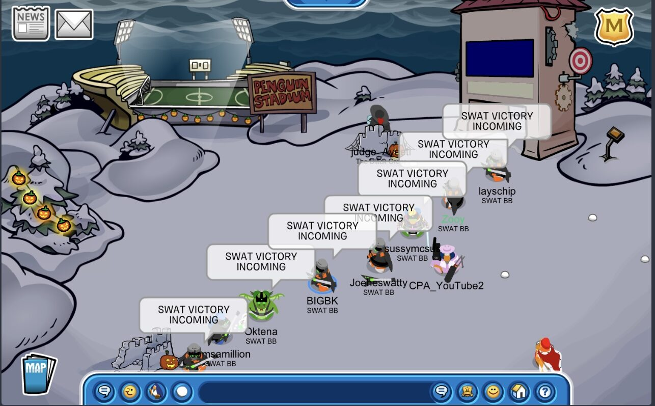 SWAT was founded on July 7, 2009, by small-medium army legend Ganger90. Since the early days, Mammoth has been the historical capital server of the army. Among the renowned leaders were SWAT veteran S Cargo2, who led the army in 2011 and 2012, SWAT legend Zuke, who led from 2013 to 2015. In 2015, the army witnessed a major shutdown following then-leader Badboy‘s departure. In 2016, the army had a short revival where they placed first in Club Penguin Army Central‘s weekly Top Ten for the first time in three years. Before Club Penguin shut down, SWAT had another short revival to complete their OPERATION: SAVE-CP in a final showdown. After multiple generations, SWAT closed its doors with the fall of Club Penguin in March 2017.
