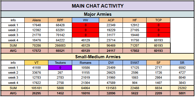 You can easily notice some data missing in the coloured cells. The Water Vikings archived their mainchat on the third week of January, so only the last week is included. The Templars lost their old server after suffering a deface, which is why there is only one week included. It should be noted that for TCP, the messages counted were from the days between January 30 and February 5, as January 30 was the first day of the new server. When it comes to the Teutons, their army opened in the second week of January, so I did not include the first week when it comes to the messages sent.