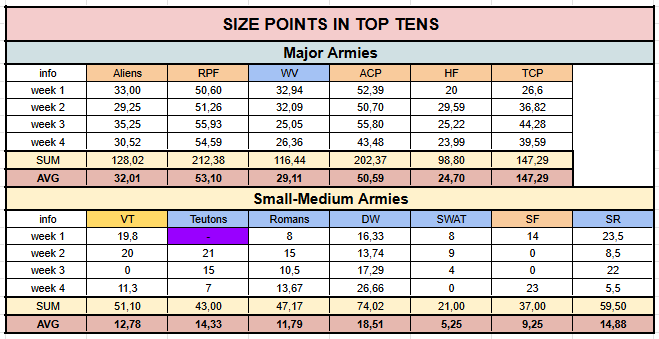 The Major army with the fewest points was the Help Force, having 24.70, while the Small Medium with the most was the Dark Warriors, with 18.51. This shows they have been close to hitting Major status for a while, before finally achieving it this week. The Special Weapons and Tactics, which has now shut down, was the army with the fewest size points. They had an average of only 5.25.