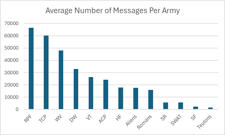 Week 4 had the most messages community-wide, as expected, since it’s the only week with data for WV and TCP. The armies had 321911 messages collectively that week, an average of 24762 per army. In total, in the full 4 weeks, there were over 973 thousand messages.