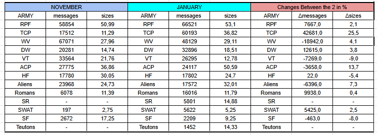 At the same time, TCP also had the biggest message increase, going up by 42681, ending up more than tripling its message count. They were followed by DW, which went up by 12615. The biggest drop was seen by WV, -18942, with VT being second, having 7269 fewer messages than in November. The most consistent army was the Help Force, gaining only 22(!) messages compared to November.