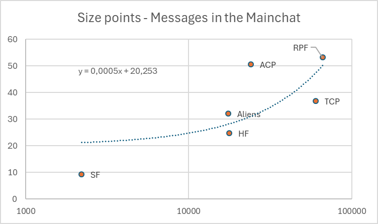 Due to the SF only hosting events in two weeks and ACP being an outlier, the line is not that accurate. The closest equation that depicts the correlation as accurately as possible is y=0.0005x + 20.253, with y = size points and x = mainchat messages.