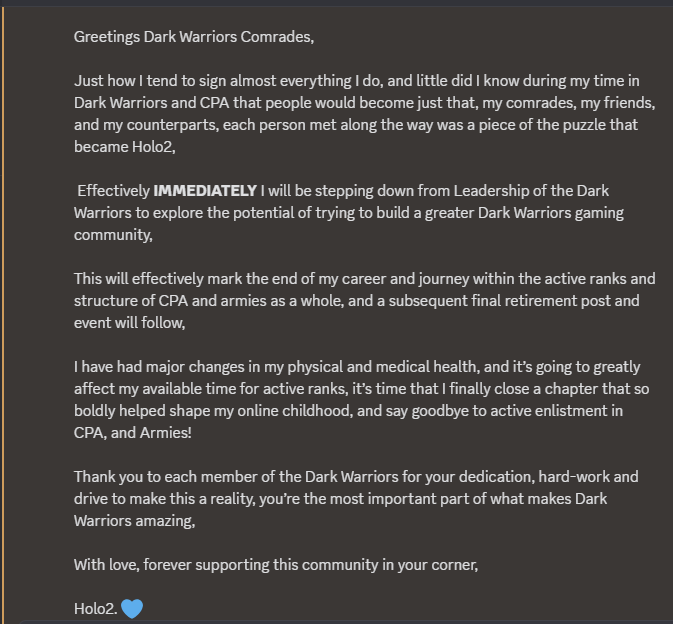A key reason behind my return to leadership is I felt as though I still have something to offer to the growth of the army, wether that be through Leadership experince, or providing my skills and abilites in other aspects of the Army, and its community and due to the unforeseen circumstances surrounding my health at the time, my retirement was rather abrupt, instead of a farewell to what shaped my childhood online experience, and it wasnt quite right to see it go in such capacity.