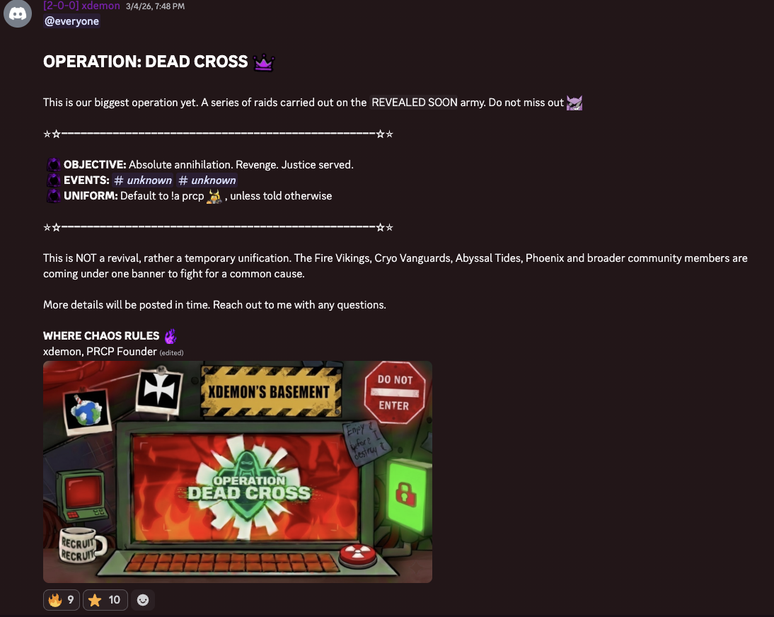 On March 4, Phantom Republic founder XDemon announced Operation: Dead Cross, describing it as a series of raids on a “mystery army” that would feature several other S/Ms within the community. PRCP hosted the event and declared a “temporary unification” with multiple armies, including the Fire Vikings, the Cryo Vanguard, the Abyssal Tides, and the Phoenix of Club Penguin. XDemon stated that these armies would unite to fight for a common cause.
