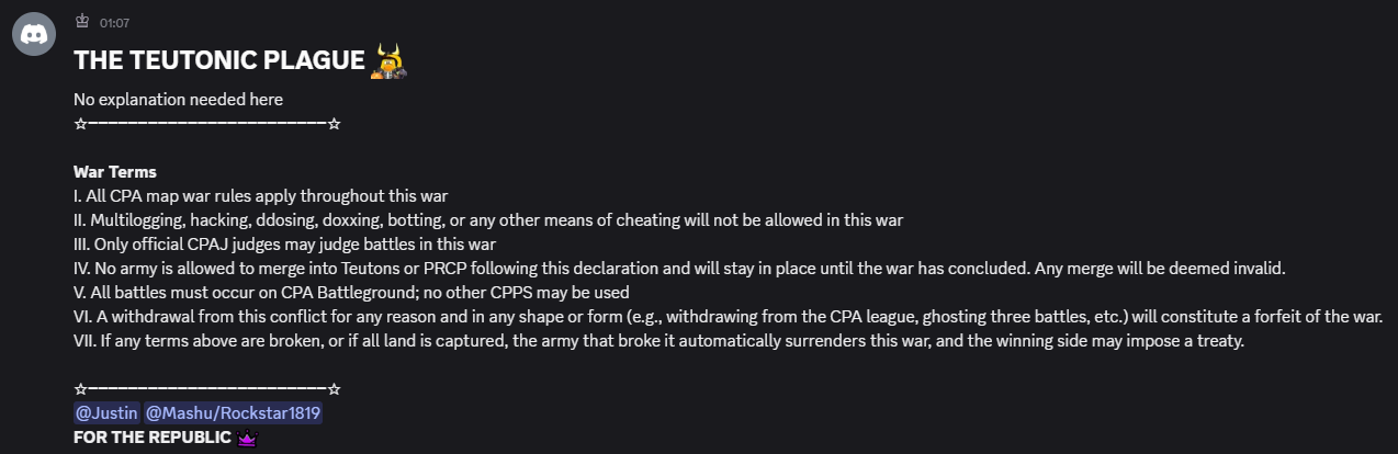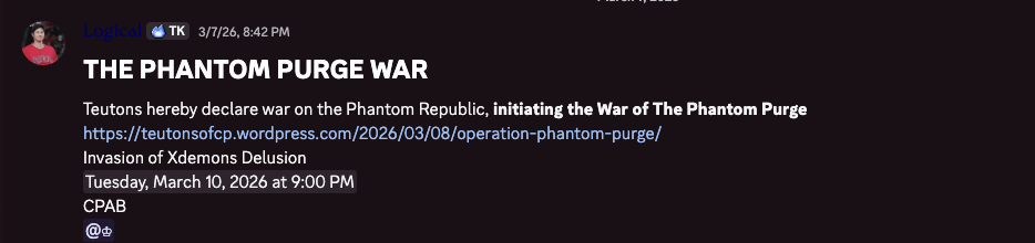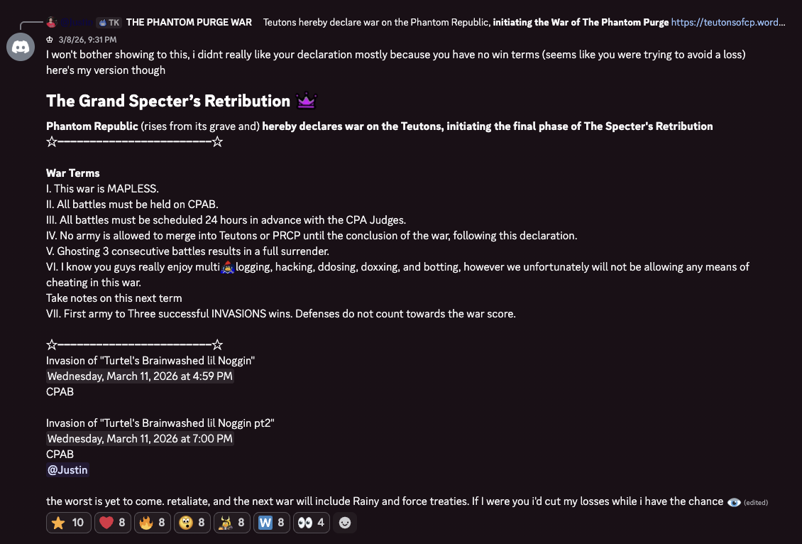 Three days later, on March 7, the Teutons learned of a PRCP raid attempt on their event. In response, they cancelled the event and retaliated by declaring an off-map war on PRCP, marking the beginning of the War of the Phantom Purge. In the war declaration post, Teutonic Leader Justin stated that the declaration stems not only from the raid attempt but also from various attempts to disrupt their community. The Teutons also declared the Republic an enemy, potentially initiating a new conflict between the two armies.