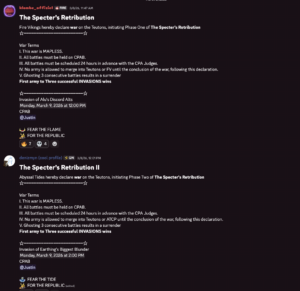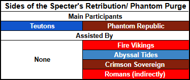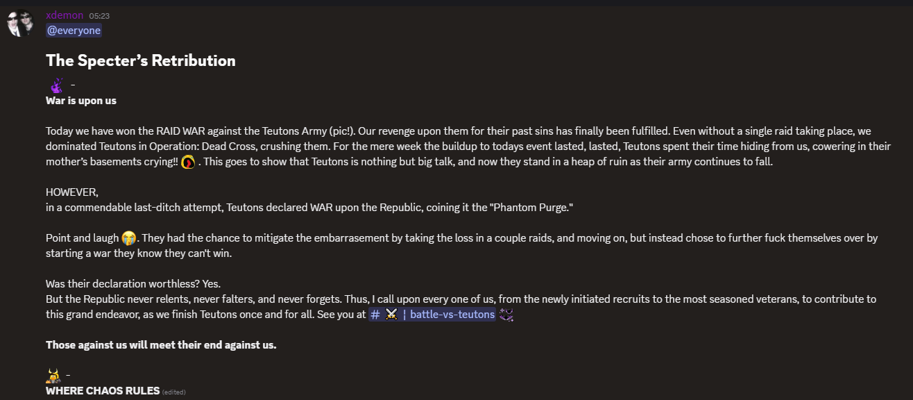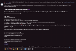 Later that night, XDemon, founder of the Phantom Republic, responded to Teuton’s declaration, redeclaring on them, initiating the final phase of The Specter’s Retribution. In this declaration, PRCP announces its revival, scheduling two invasions that will take place on Wednesday. The armies initially mentioned in the Operation, and the ones that additionally declared war on the Teutons, all seem to have a part in this, with the S/M group planning to assist each other throughout the invasions. Outside of these armies, the Romans have also offered support to the PRCP side initially. Later, they decided to stay out of the war and ceased their support.