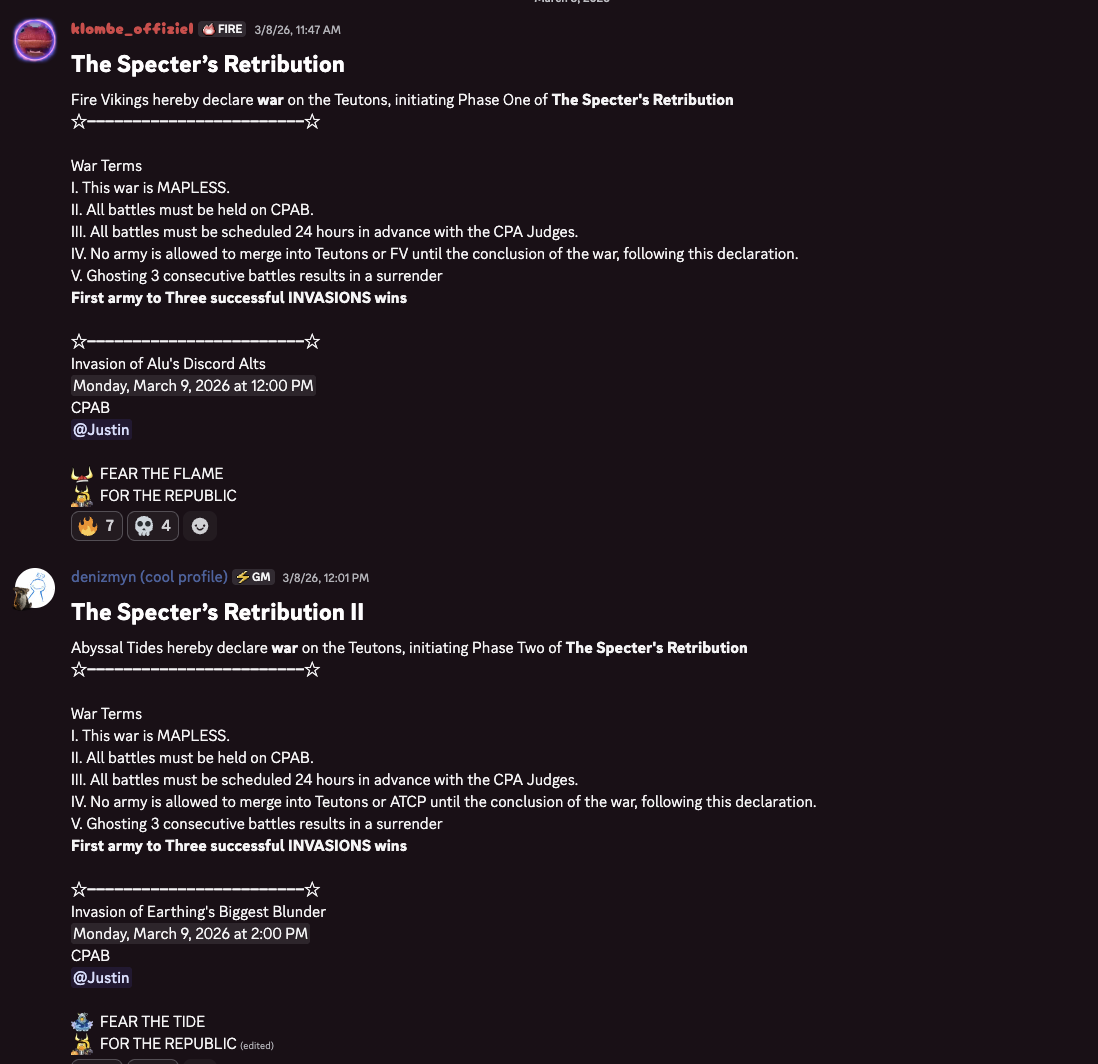 On March 8, Klombe, leader of the Fire Vikings, declared war on the Teutons, aiding PRCP in the conflict. In their declaration, FV stated that it was phase one of The Specter’s Retribution, likely a part of Operation: Dead Cross. The conflict further escalated when, less than an hour later, Abyssal Tides leader Denizmyn also declared war on the Teutons, initiating phase two of The Specter’s Retribution. Subsequent invasions were scheduled for the next day, 2 hours apart, with both armies aiming to help each other in the conflict. The Crimson Sovereign, led by Fruit Salad, additionally declared war on the Teutons, hoping to also help the other S/Ms in the war.
