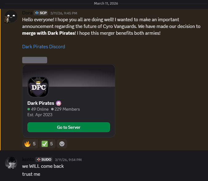 On March 11, the Cryo Vanguards announced a merger with the Dark Pirates of Club Penguin. The Dark Pirates is an army expected to reopen on March 21 at their Order of Revival event. This development comes soon after the Vanguards sent support to the Phantom Republic of Club Penguin in their war against the Teutons, and also after the Romans declared war against the army. Moreover, the new generation of the Dark Pirates would be led by Cyber and Siri. It appears that Dark Pirates founder Ninja Leader will be solely advising the returning army.