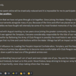 About a month after the Legends Cup win, Cabin retired from the community again. However, he couldn’t stay away for long and returned in January 2023 to start his own group, the Napalm Corps. Under his solo leadership, the army became a regular name on the Top Ten lists, often seeing more than 10 penguins at events.
