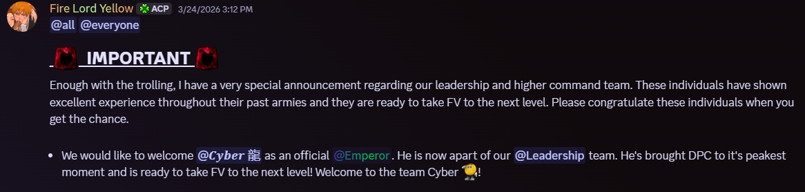 On March 24, army founder of the Fire Vikings, Yellow Typer, posted an announcement in the server. In this announcement, Yellow Typer posted a promotion of Cyber, just days after the couping of their former leader, Klombe, following words off a potential deface. This new leadership will promise new change to the Fire Vikings, especially with Cyber’s own pesonal experience within the army community with leadership.