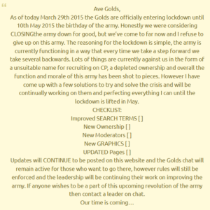 The Golds went into a temporary lockdown on March 29, 2015. The leader Jack formally announced the decision on the army’s official website. In order to address persistent issues and rebuild the army, the lockdown was planned to last until May 10th, the army’s birthday. Jack clarified that the army had been unstable lately, with low morale and dwindling leadership, made worse by Club Penguin recruiting challenges brought on by a “unsuitable name.” The possibility of completely disbanding the army was carefully considered before deciding to impose a lockdown.