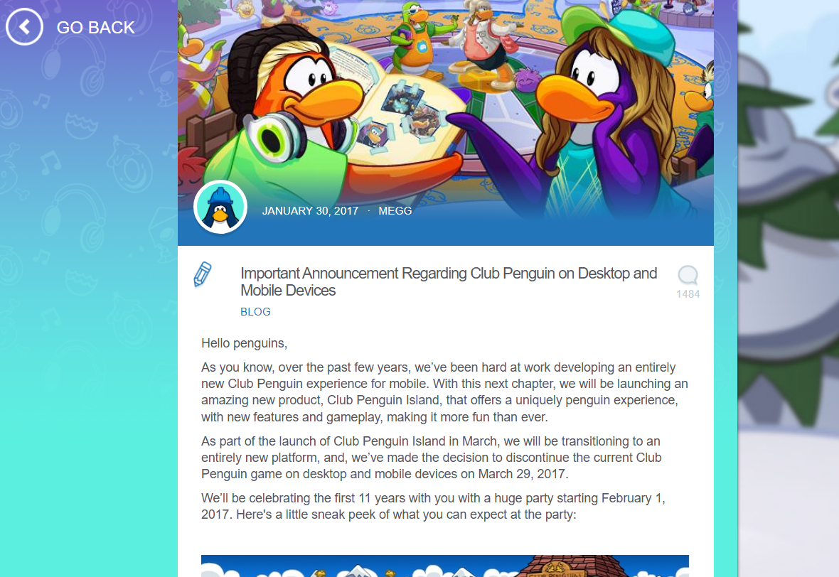 The new title, Club Penguin Island, aimed to transfer the experience to mobile and current devices. Prior to its demise, Club Penguin provided free memberships to all players and conducted goodbye parties, allowing the community to appreciate the world they had helped construct over 11 years.