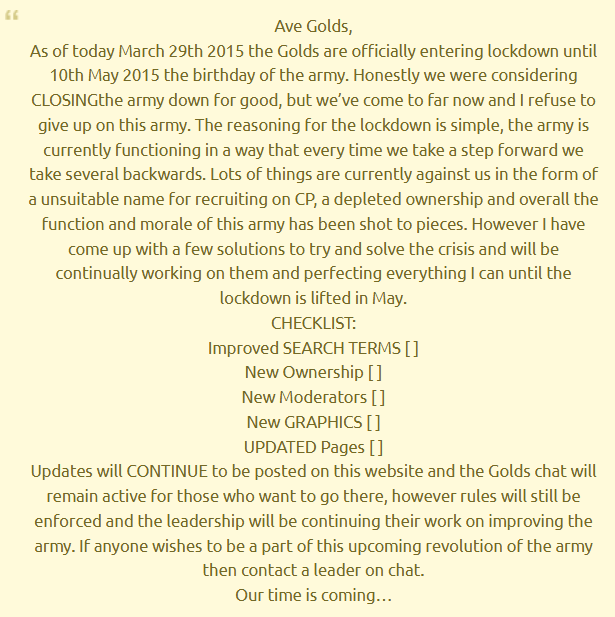 The Golds went into a temporary lockdown on March 29, 2015. The leader Jack formally announced the decision on the army’s official website. In order to address persistent issues and rebuild the army, the lockdown was planned to last until May 10th, the army’s birthday. Jack clarified that the army had been unstable lately, with low morale and dwindling leadership, made worse by Club Penguin recruiting challenges brought on by a “unsuitable name.” The possibility of completely disbanding the army was carefully considered before deciding to impose a lockdown.